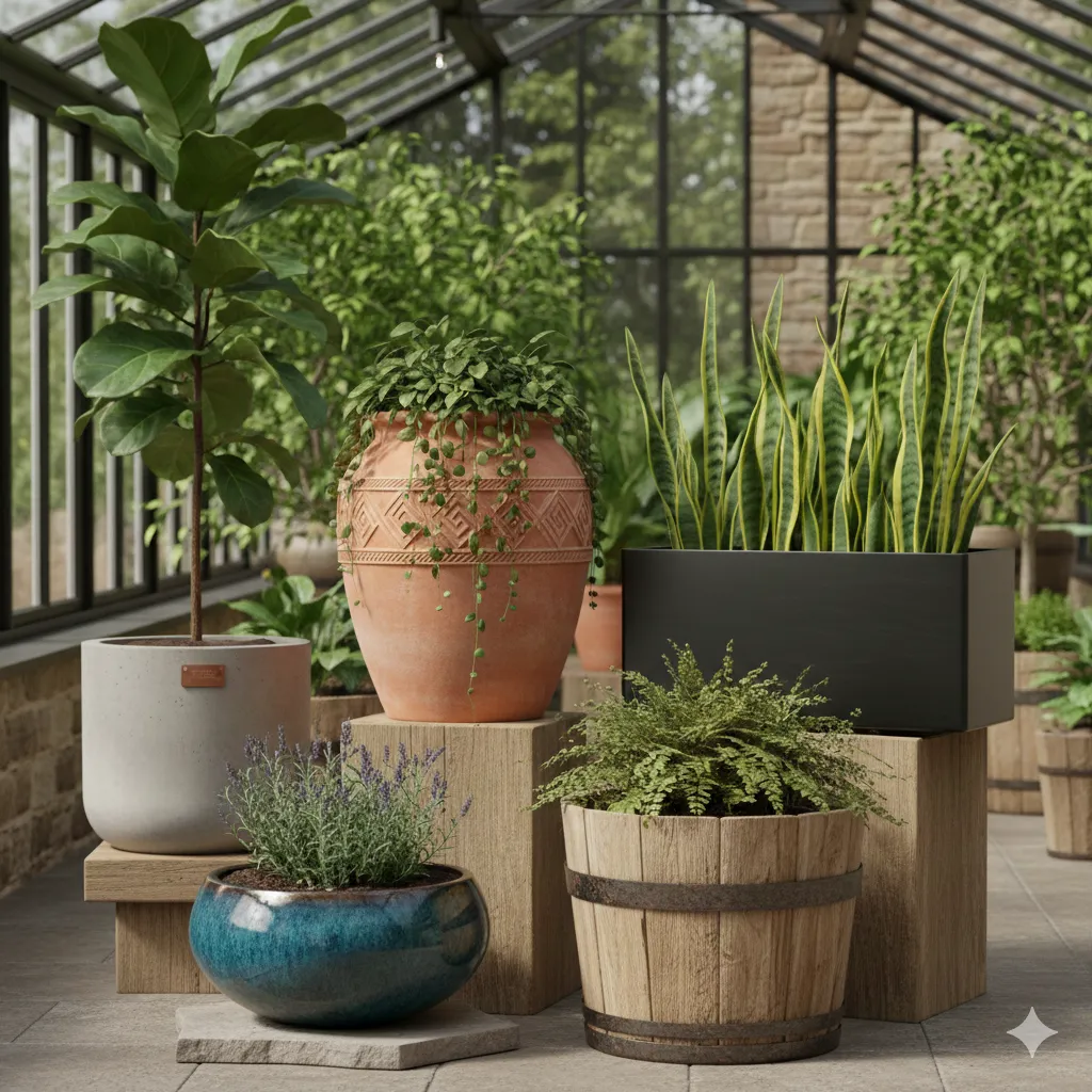A beautiful collection of five ceramic planters in various sizes, designed for optimal plant growth. Includes drainage systems and matching saucers. Ideal for creating lush green spaces.